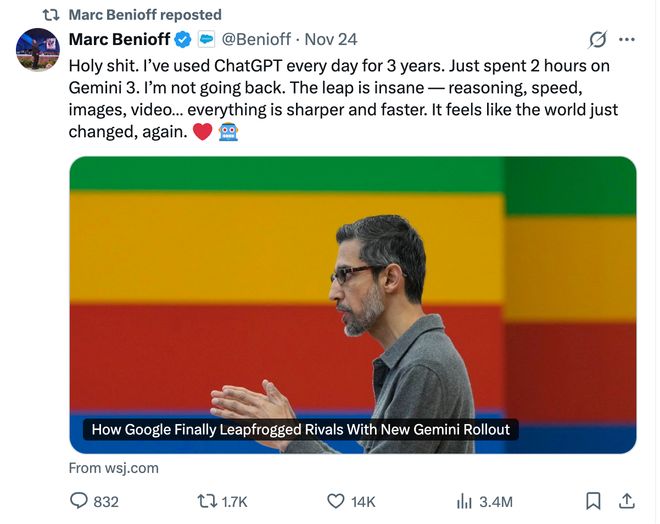 Gemini 3和Nano Banana正是基于谷歌TPU进行训练,全球云巨头Salesforce首席执行官马克·贝尼奥夫(Marc Benioff)11月24日在社交平台X上发帖称:“过去三年我每天都用ChatGPT,刚花了两个小时用Gemini 3,我回不去了。这升级太疯狂了……感觉世界又变天了。”